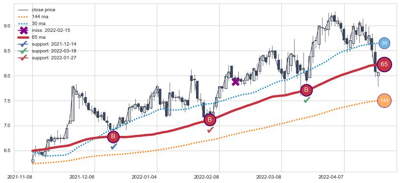 ⚅ 买点向上突破均线后,价格走势有持续向上的迹象,但动能稍显不足,迟迟不能远离均线