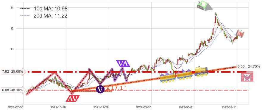 ♘ 支撑价格位7.82,可信任强度97.92%,距离最后交易2022-08-12形成的收盘价格11.02相差 -29.08%