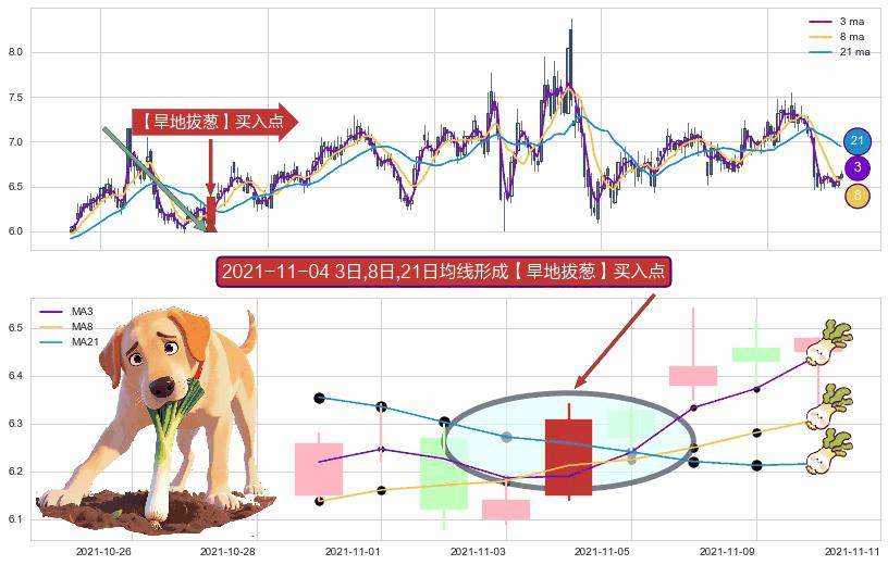 形态多维评估: ⚀ 2021-11-04日显现 3日-8日-21日均线 【旱地拔葱】买入点 看多信号,后市看涨,买入