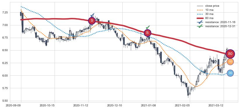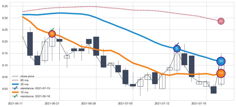 下跌趋势2021-06-11-2021-07-21,均线10, 30确认关键阻力2处