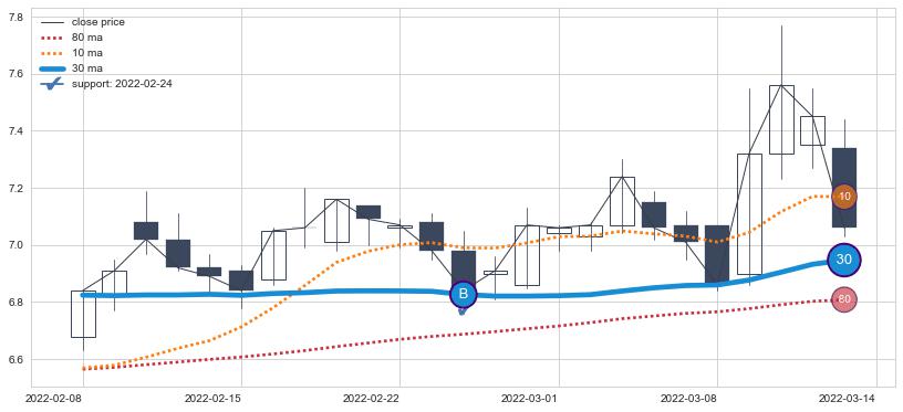 上涨趋势2022-07-04-2022-07-29,均线80, 30确认关键支撑1处