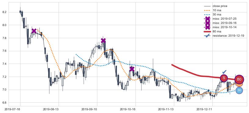 下跌趋势2019-07-16-2019-12-27,均线80确认关键阻力1处