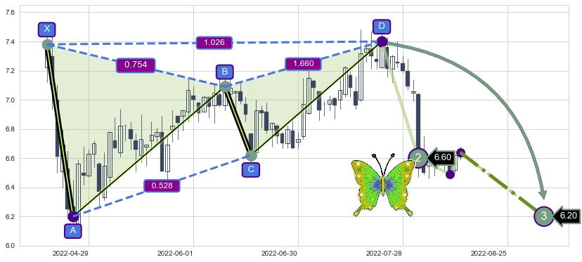 ➣ 已完成【蝴蝶】形态起点X: 2022-04-19, 终点D: 2022-07-22, 共65交易日