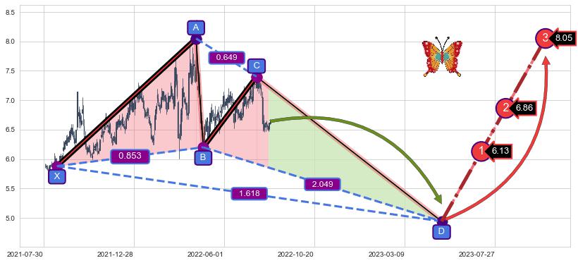 ➣ 未完成【蝴蝶】形态起点X: 2021-08-20, 已到达C点: 2022-07-22, 预测最终D点: 2023-05-05, 共425交易日