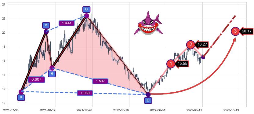➣ 已完成【鲨鱼】形态起点X: 2021-08-04, 终点D: 2022-04-25, 共174交易日