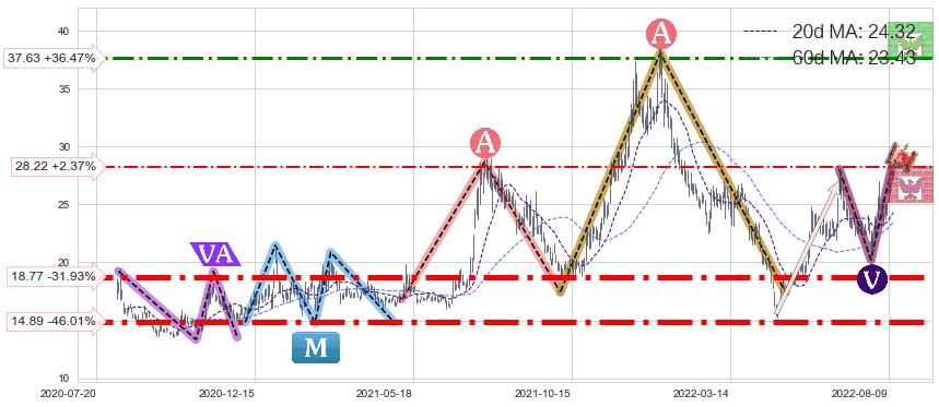 ♘ 阻力价格位37.63,可信任强度55.85%,距离最后交易2022-08-12形成的收盘价格27.57相差 +36.47%