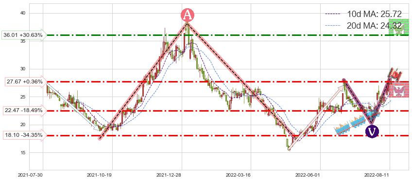 ♘ 支撑价格位22.47,可信任强度67.00%,距离最后交易2022-08-12形成的收盘价格27.57相差 -18.49%