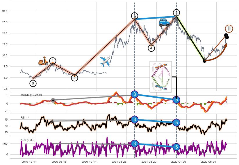 ➢ 1,3,5驱动浪MACD, RSI, KDJ走势都出现【常规背离】反转信号增强