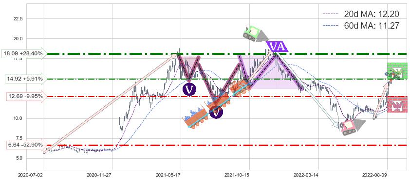 ♘ 阻力价格位14.92,可信任强度48.76%,距离最后交易2022-08-12形成的收盘价格14.09相差 +5.91%