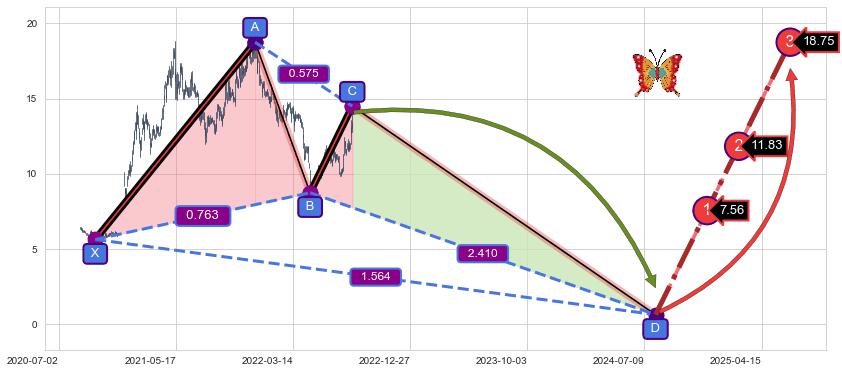➢ 距离预测D点位置有足够的下跌空间, 与看涨【蝴蝶】形态相反,实际方向【看跌】