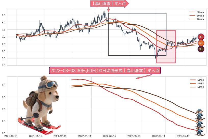 ⚀ 2021-12-17日-2022-05-25日显现 30日-60日-90日均线 【高山滑雪】买入点 看多信号,后市看涨,买入