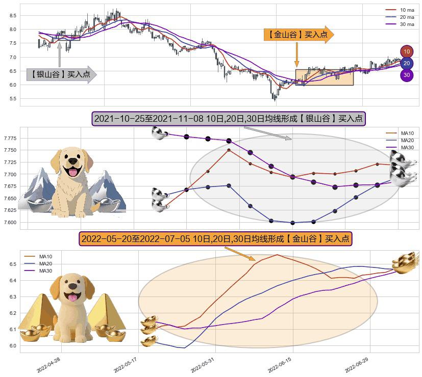 ⚃ 2022-05-23-日至2022-07-05-日显现 10日-20日-30日均线 【金山谷】买入点 其再次确认了买入信号,可靠性更强,买入