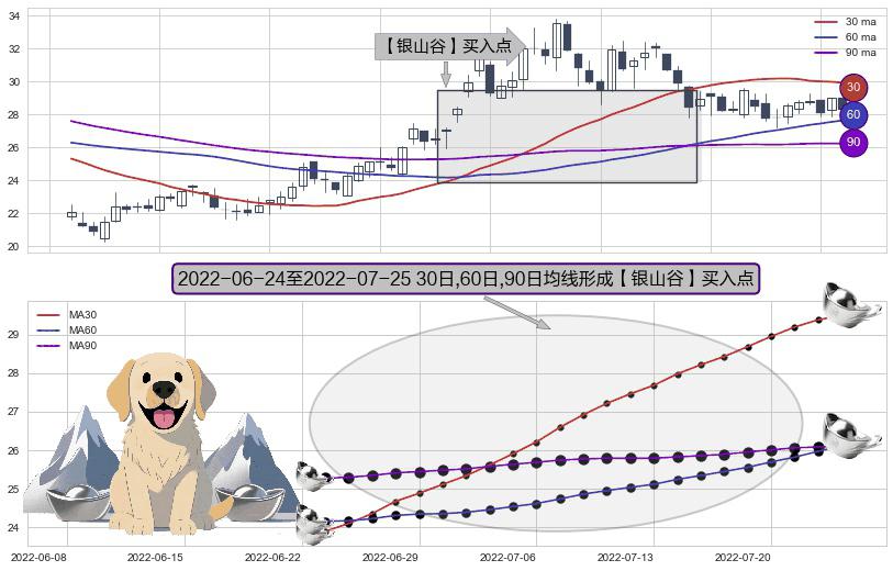 ⚀ 2022-06-27-日至2022-07-25-日显现 30日-60日-90日均线 【银山谷】买入点 看多信号,后市看涨,买入