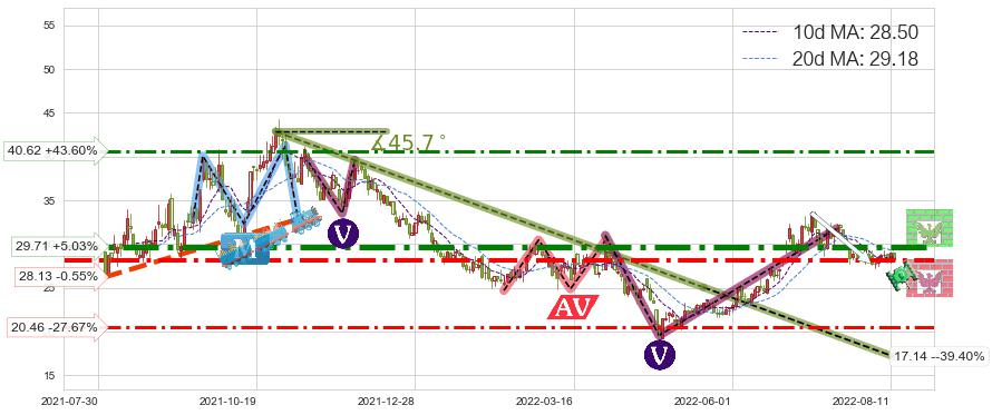 ♘ 阻力价格位29.71,可信任强度85.71%,距离最后交易2022-08-12形成的收盘价格28.29相差 +5.03%