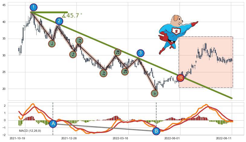 ➣ D点拟合预测价格41.75,距离最后交易收盘价格28.29相差 +47.59%