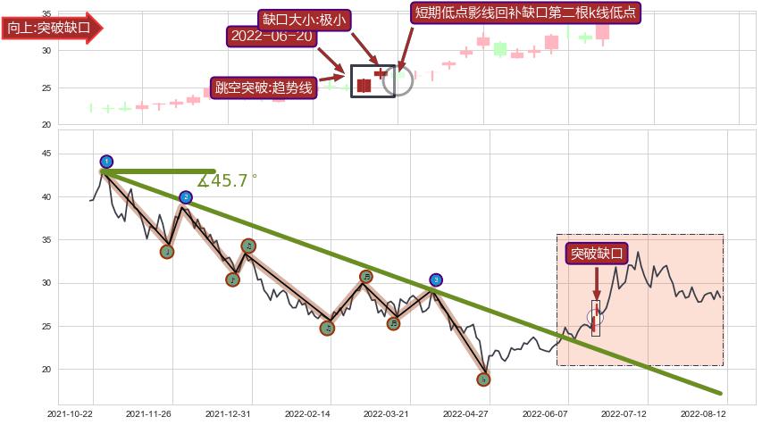 ➣ 突破缺口形成后,后续k已经超过14根,跳空突破趋势线关键点后, 出现【轻微回踩】迹象,短期低点影线回补缺口第二根k线低点