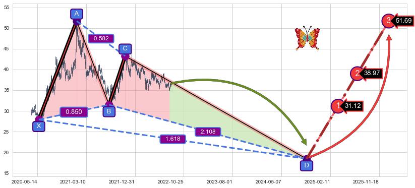 ➣ 未完成【蝴蝶】形态起点X: 2020-05-22, 已到达C点: 2021-11-05, 预测最终D点: 2024-09-27, 共1091交易日