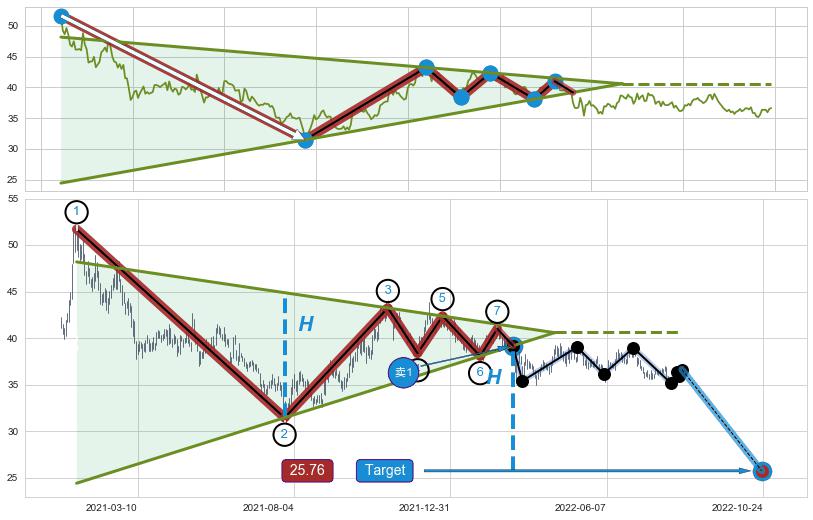➢ 最小中继整理跌幅→𝐇: 20.23 (𝐇楔型旗杆的长度:楔型起点→顶点)