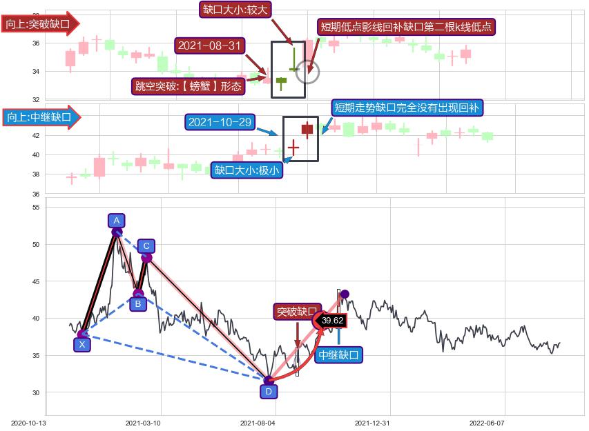➣ 突破缺口形成后,后续k已经超过14根,跳空突破【螃蟹】形态关键点后, 出现【轻微回踩】迹象,短期低点影线回补缺口第二根k线低点