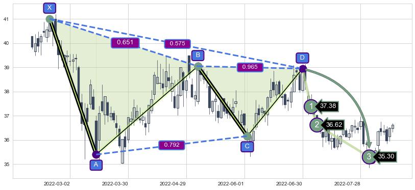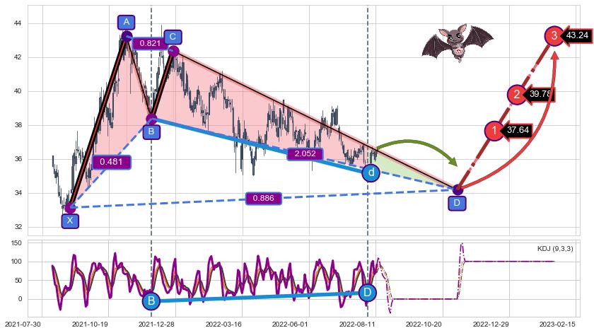 ➣ 未完成【蝙蝠】形态起点X: 2021-08-30, 已到达C点: 2021-12-24, 预测最终D点: 2022-11-04, 共284交易日