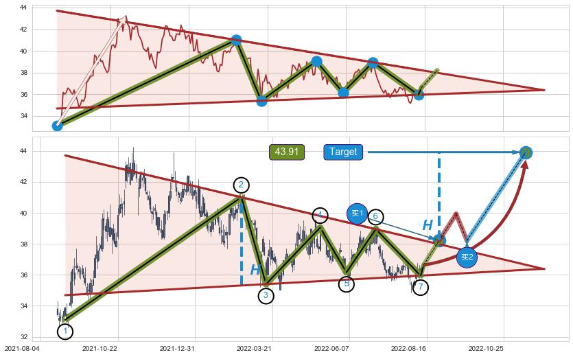 ➢ 最小中继整理涨幅→𝐇: 5.70 (高点逐步降低斜边第一阻力点②与支撑边垂直距离)