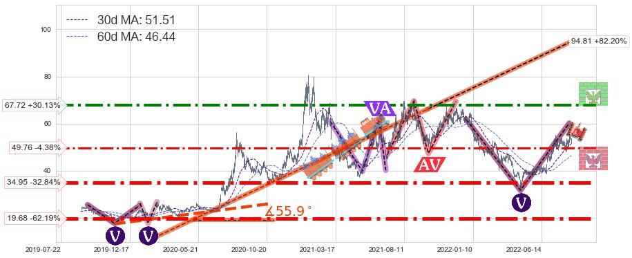 ♘ 支撑价格位19.68,可信任强度89.23%,距离最后交易2022-08-12形成的收盘价格52.04相差 -62.19%