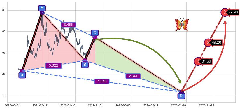➣ 未完成【蝴蝶】形态起点X: 2020-06-15, 已到达C点: 2022-08-09, 预测最终D点: 2024-12-30, 共1148交易日