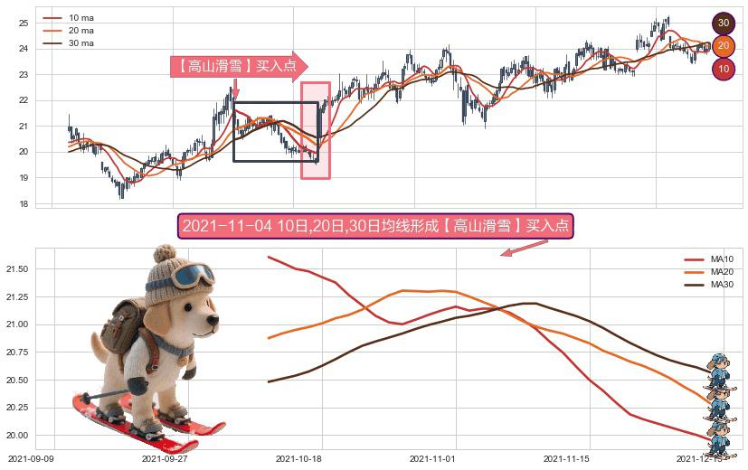 ⚀ 2021-10-12日-2021-11-26日显现 10日-20日-30日均线 【高山滑雪】买入点 看多信号,后市看涨,买入
