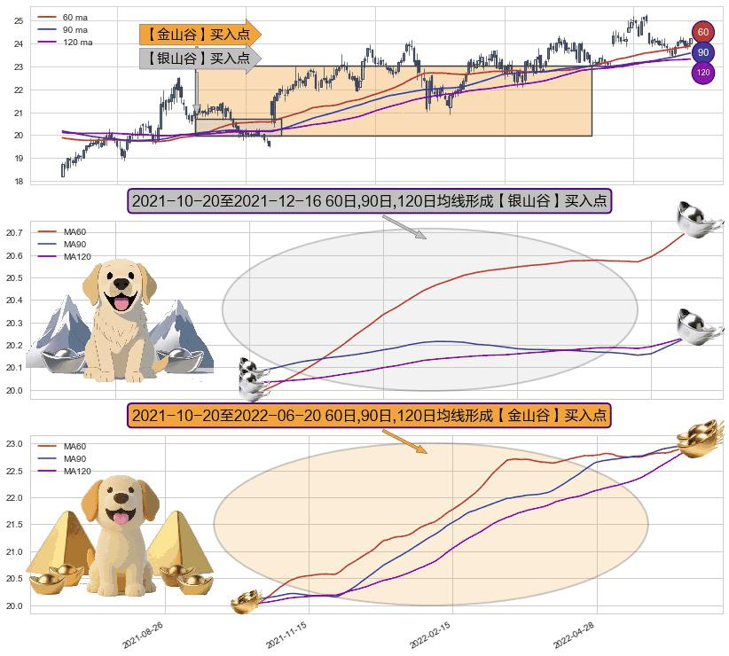 ⚀ 2021-10-21-日至2022-06-20-日显现 60日-90日-120日均线 【金山谷】买入点 其再次确认了买入信号,可靠性更强,买入