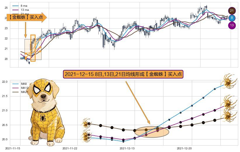 ⚀ 2021-12-15日显现 8日-13日-21日均线 【金蜘蛛】买入点 看多信号,后市看涨,买入