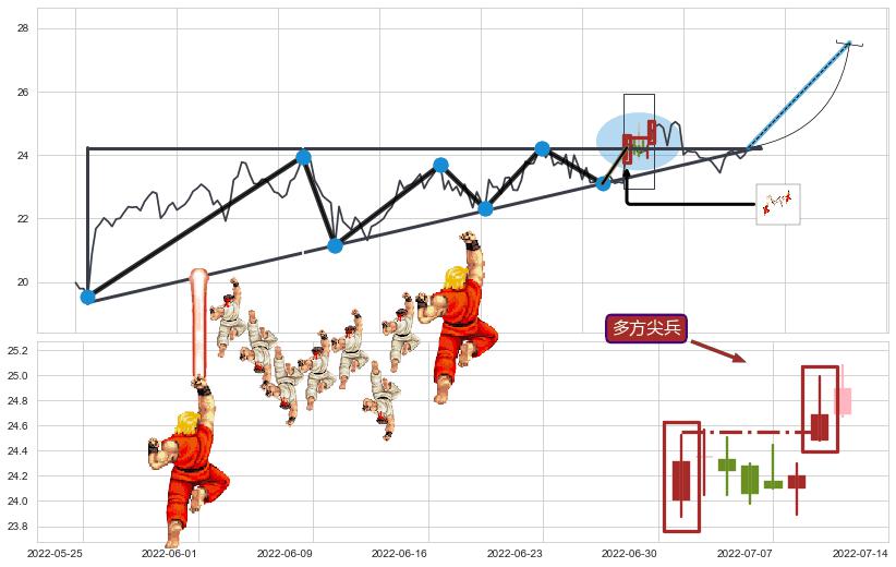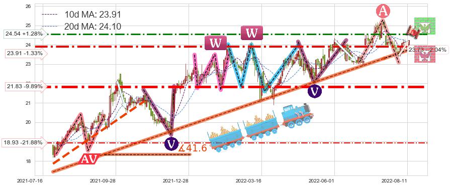 ➢ 【空方力量耗尽,多方打破攻守平衡点】上升三角形中继整理, 已在2022-07-01突破【阻力】颈线 24.23 →演变成上升通道