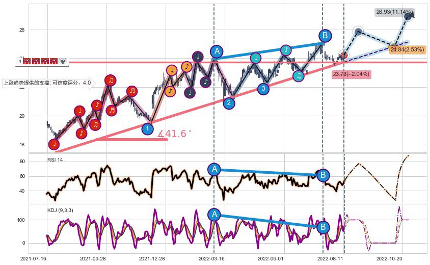 ♘ 支撑价格位23.91,可信任强度82.80%,距离最后交易2022-08-12形成的收盘价格24.23相差 -1.33%
