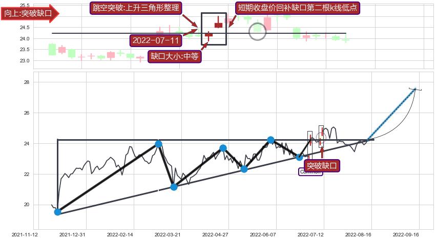 ➣ 突破缺口形成后,后续k已经超过14根,跳空突破上升三角形整理关键点后, 出现【中度回踩】迹象,短期收盘价回补缺口第二根k线低点