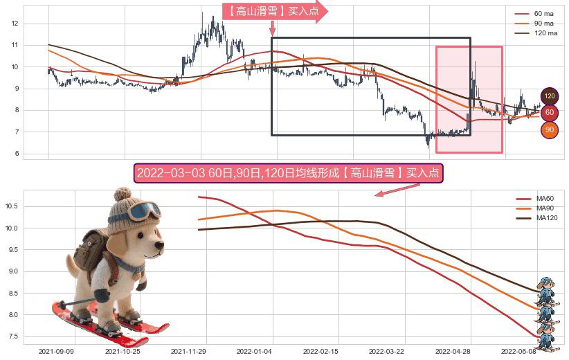 ⚀ 2021-11-24日-2022-06-09日显现 60日-90日-120日均线 【高山滑雪】买入点 看多信号,后市看涨,买入