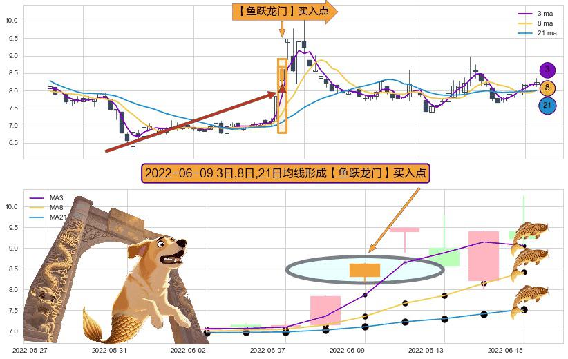 ⚀ 2022-06-09日显现 3日-8日-21日均线 【鱼跃龙门】买入点 看多信号,后市看涨,买入