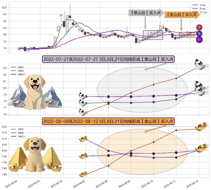 ⚀ 2022-08-09-日至2022-08-12-日显现 3日-8日-21日均线 【金山谷】买入点 其再次确认了买入信号,可靠性更强,买入