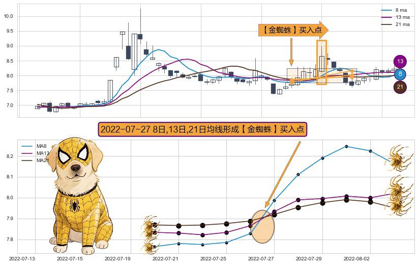 ⚀ 2022-07-27日显现 8日-13日-21日均线 【金蜘蛛】买入点 看多信号,后市看涨,买入