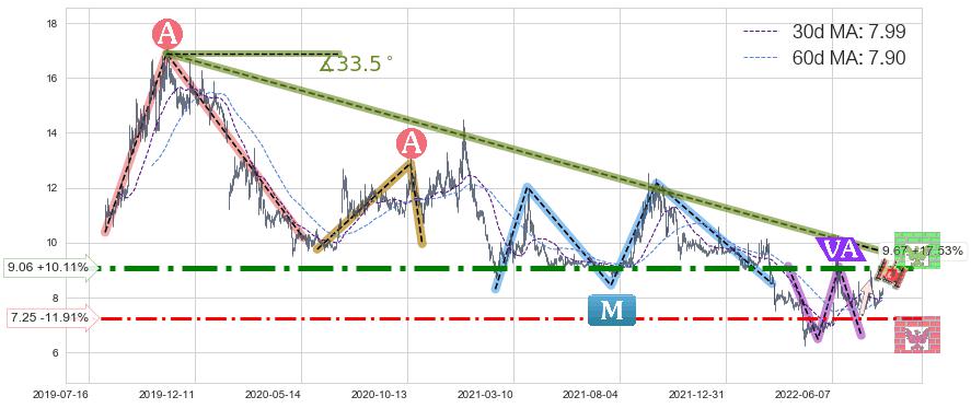 ♘ 在最后的下跌阶段2019-11-04至2022-06-09,存在 持续未破位的阻力位 ,阻力价格9.67,可信任强度83.02%,其距离最后价格8.23相差 +17.53%