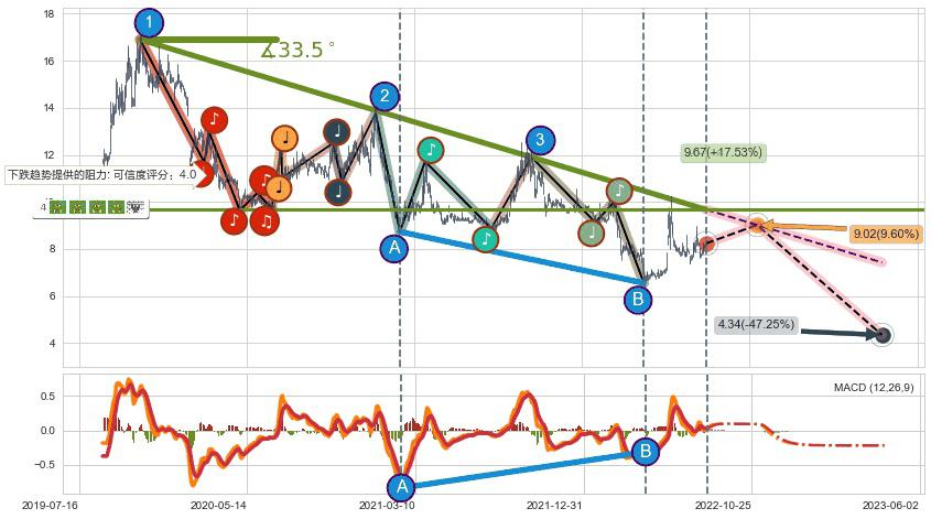 ♘ 阻力价格位9.06,可信任强度85.33%,距离最后交易2022-08-12形成的收盘价格8.23相差 +10.11%