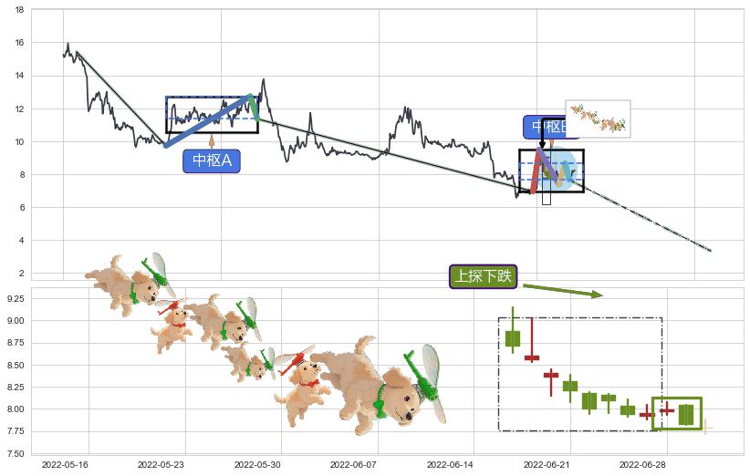 ➣ 【中枢B】:2022-05-30-2022-08-03,中枢由5笔构成,共47交易日, ZG=8.65, ZD=7.65