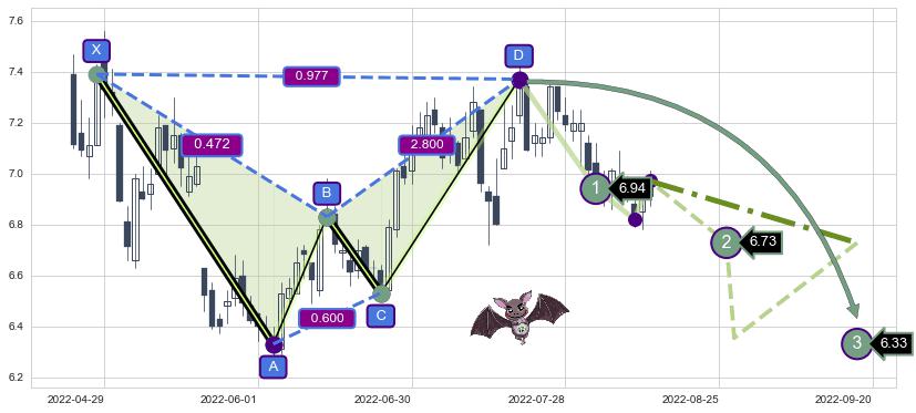 ➣ 已完成【蝙蝠】形态起点X: 2022-04-28, 终点D: 2022-07-20, 共56交易日