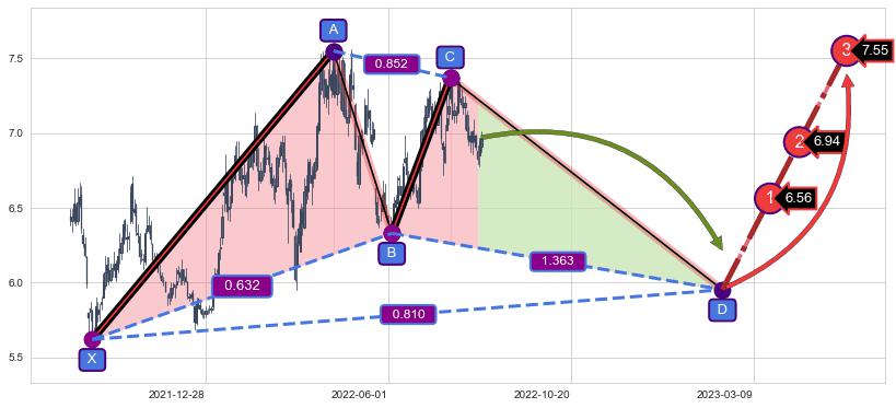 ➣ 已完成【蝴蝶】形态起点X: 2022-03-21, 终点D: 2022-06-06, 共50交易日
