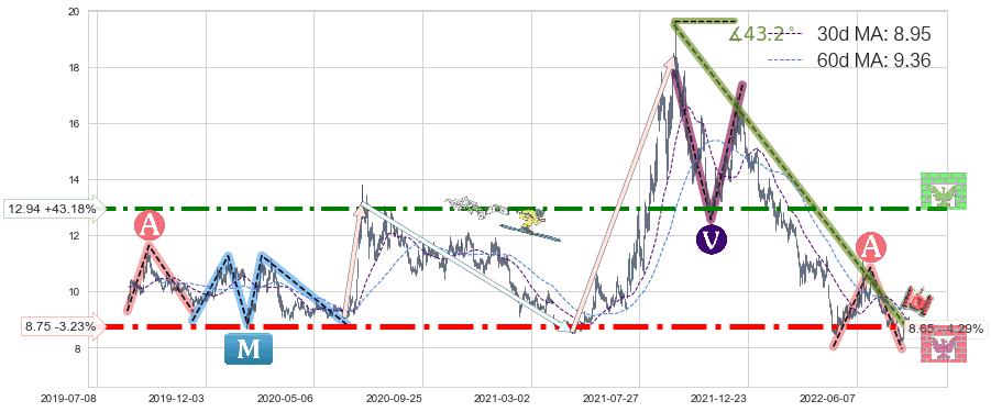 ♘ 支撑价格位8.75,可信任强度91.28%,距离最后交易2022-08-12形成的收盘价格9.04相差 -3.23%