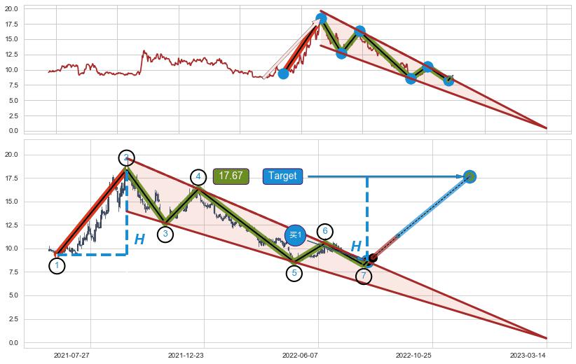 ➢ 最小中继整理涨幅→𝐇: 9.05 (𝐇楔型旗杆的长度:楔型起点→顶点)