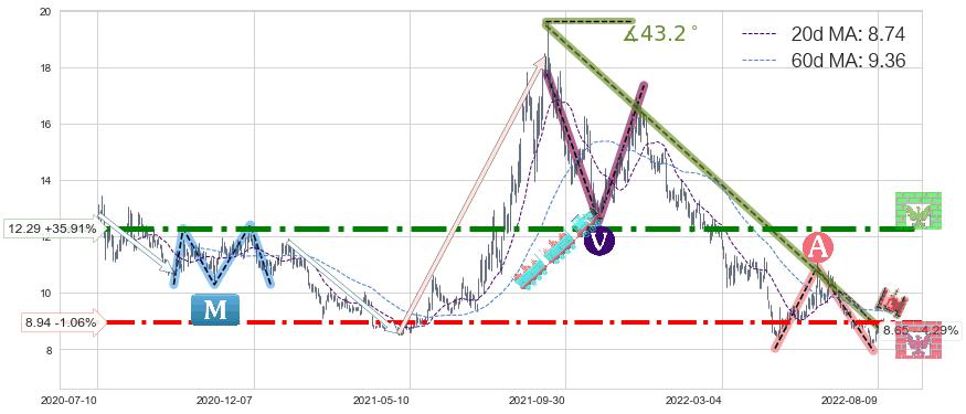 ♞ 20日均线:8.74,60日均线:9.36→ 快线<慢线