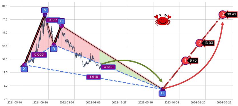 ➣ 未完成【螃蟹】形态起点X: 2021-05-21, 已到达C点: 2021-12-16, 预测最终D点: 2023-07-05, 共520交易日