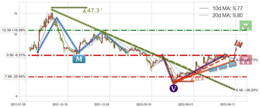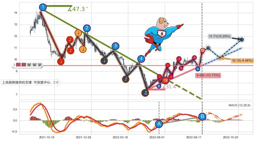 ♘ 支撑价格位9.96,可信任强度77.10%,距离最后交易2022-08-12形成的收盘价格10.62相差 -6.21%
