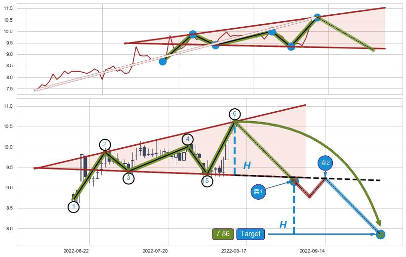 ➢ 最小反转跌幅→𝐇: 1.3145 (逐步抬高阻力斜边最后的阻力点⑥与支撑边垂直距离)