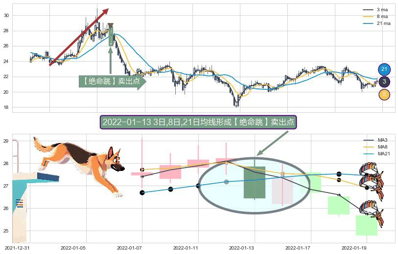 形态多维评估: ⚀ 2022-01-13日显现 3日-8日-21日均线 【绝命跳】卖出点 看空信号,后市看跌,卖出
