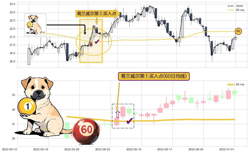 形态多维评估: ⚀ 2022-06-06-日显现 葛兰威尔均线 60日均线 第买①入点 走势反转见底信号,后市看涨,买进信号